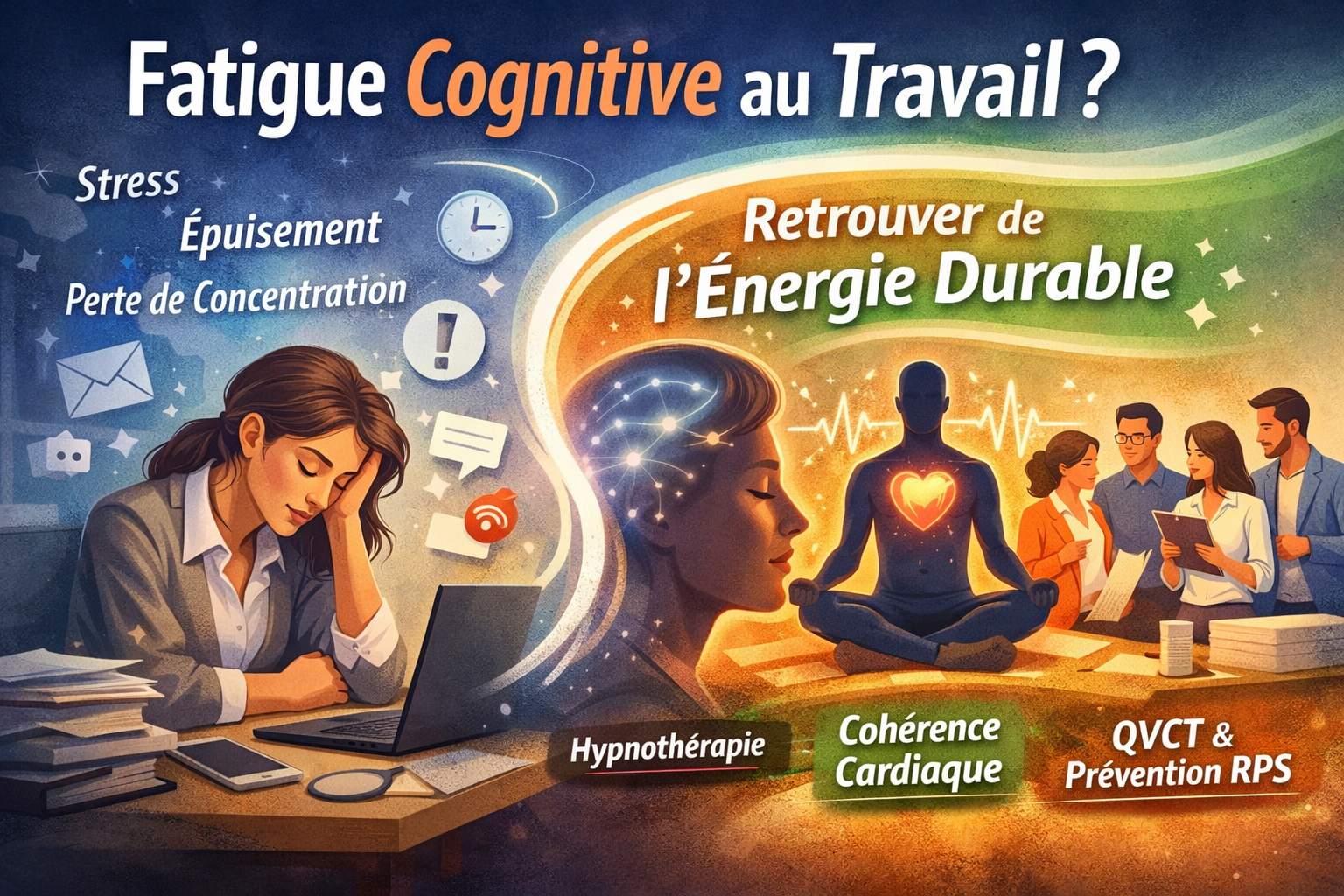 Dans cet article, vous allez comprendre ce qu’est la fatigue (et notamment la fatigue cognitive), pourquoi elle augmente dans les organisations modernes, et comment des outils concrets comme l’hypnothérapie, la cohérence cardiaque et une démarche QVCT / prévention RPS peuvent aider à récupérer et prévenir l’épuisement.