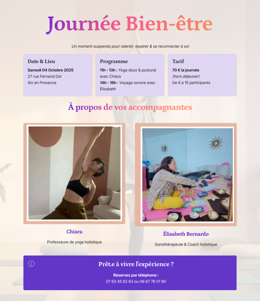 Chaque organisation est unique. C’est pourquoi mes interventions en événements bien-être en entreprise sont adaptées à votre contexte, votre culture et vos objectifs. Un entretien préalable permet de créer un programme qui a du sens et un impact durable.