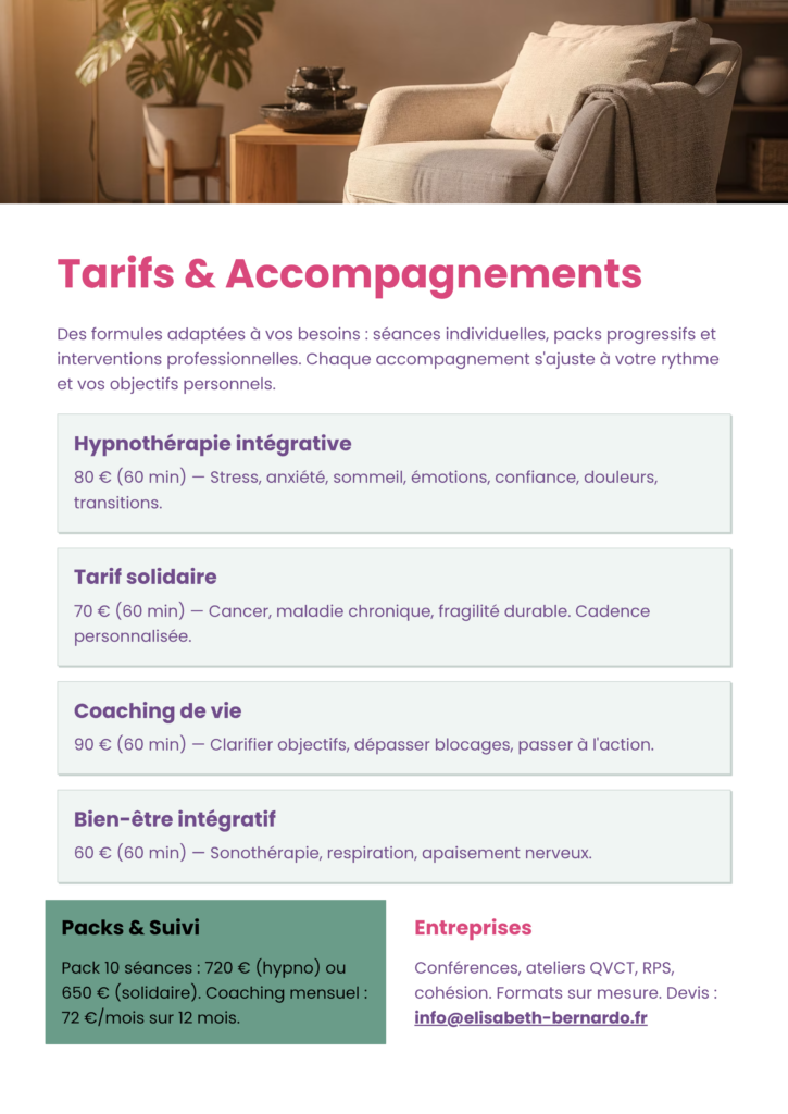 hypnothérapie la garenne-colombes, coach développement personnel, sonothérapie, qualité de vie au travail, QVCT, RPS, conférences bien-être, séance hypnose prix, accompagnement entreprise bien-être Tarifs hypnothérapie, coaching et accompagnements bien-être avec Élisabeth Bernardo – membre du SNH. Séances individuelles, coaching mensuel, packs, et tarifs solidaires pour les personnes en parcours de soins. Paiement par virement (sans frais) ou en ligne (Stripe / PayPal +2 €).